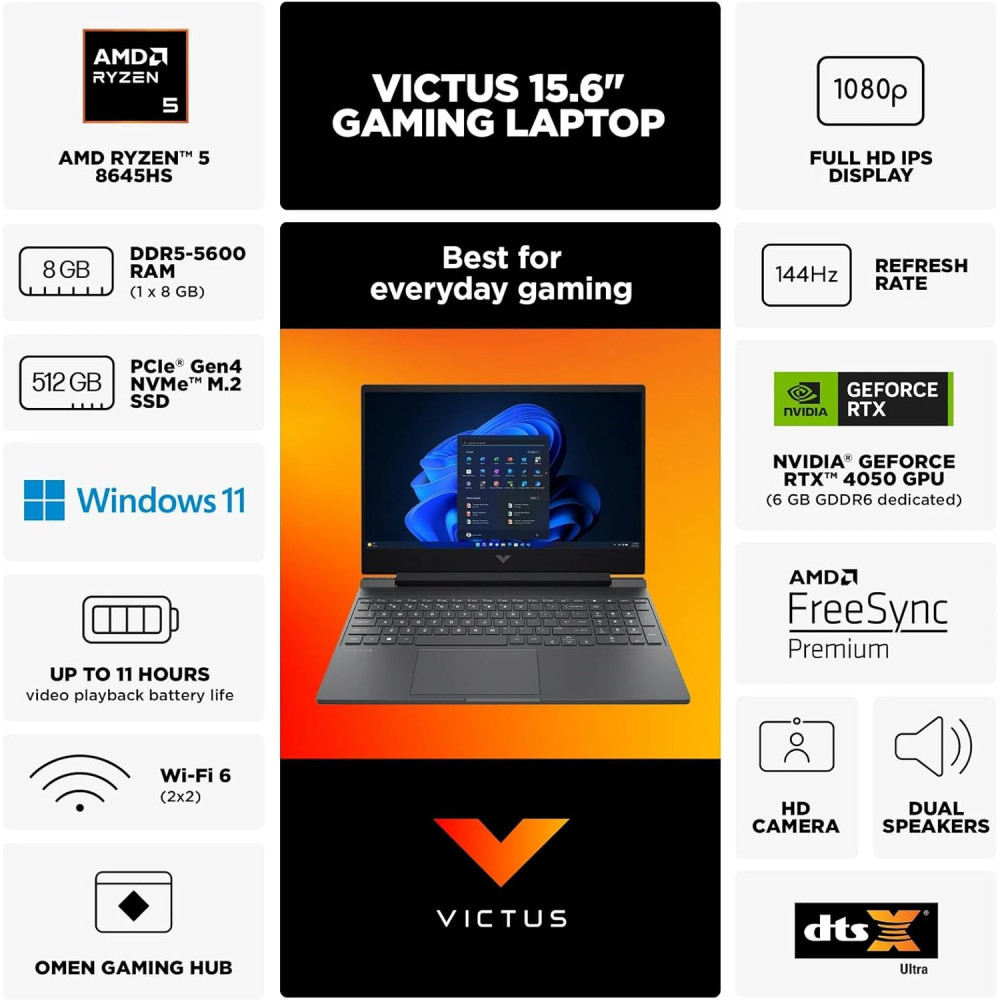 HP Victus Gaming Laptop, 15.6" FHD 144Hz Display, AMD Ryzen 5 8645HS, 16GB DDR5 RAM, 1TB SSD, NVIDIA GeForce RTX 4050 (6GB GDDR6), HDMI, Webcam, Backlit Keyboard, Wi-Fi 6, Windows 11 Home, Mica Silver